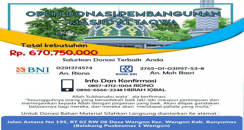 Marilah kita berdonasi untuk pembangun maajid At Taqwa ,komplek MTs Muhamadiyah Wangon. Kebutuhan kami sebanyak Rp. 670.750.000 ,-. Salurkan donasi anda melalui transfer ke rek BNI : 029137457 4 a.n . Riono, atau Ke rek BRI: 3765-01-031197-53-8 Moh Basri